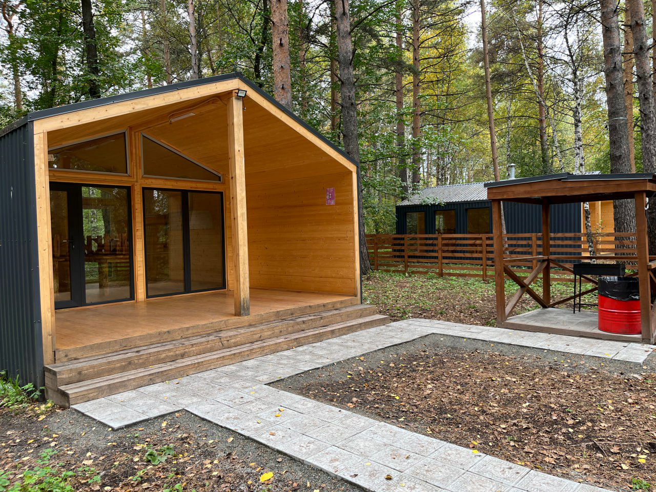 Современная беседка – шале с панорамными окнами для большой компании